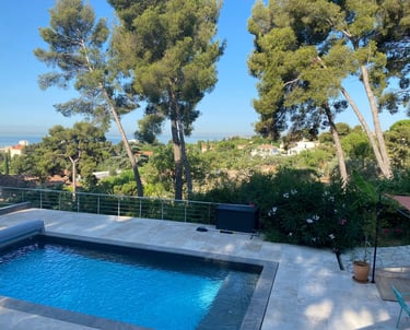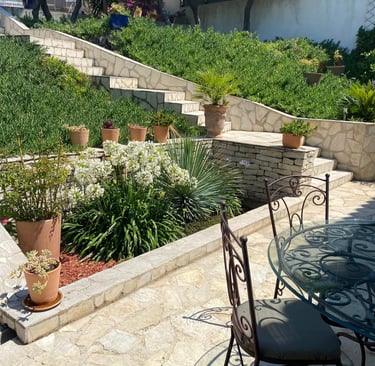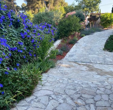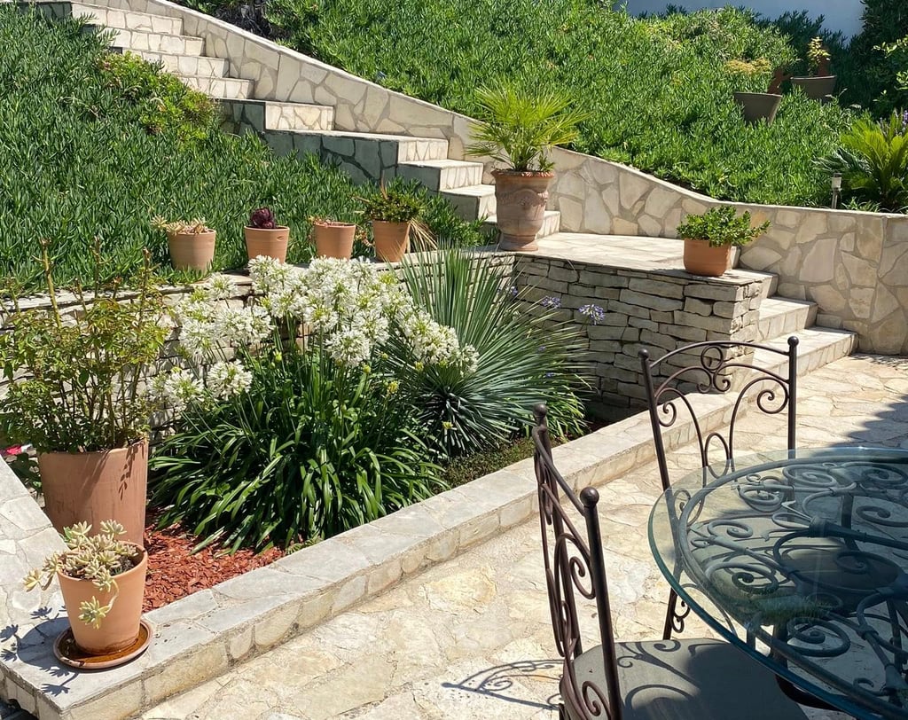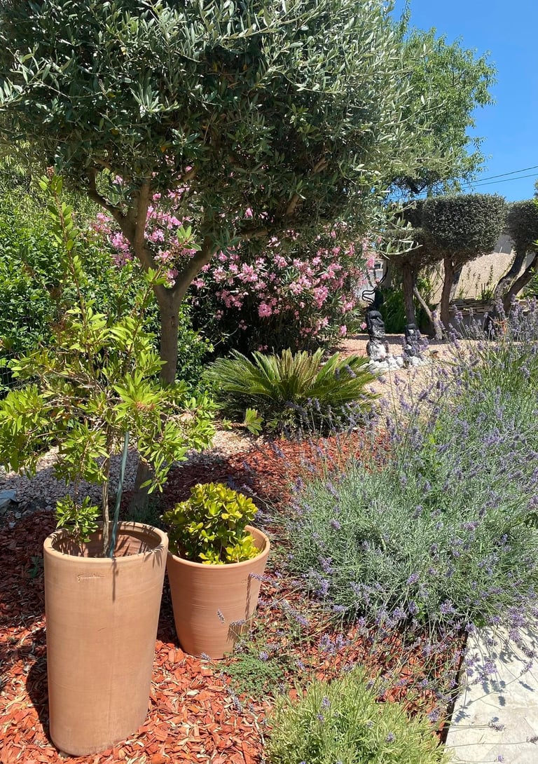 Nous avons entièrement repensé le jardin en redéfinissant les niveaux selon leurs usages, en mêlant une ambiance provençale avec de belles poteries Ravel et toscanes, et une atmosphère méditerranéenne douce grâce à des lauriers-roses et des ipomées bleus grimpants.