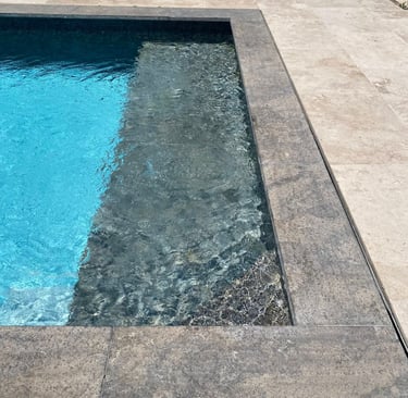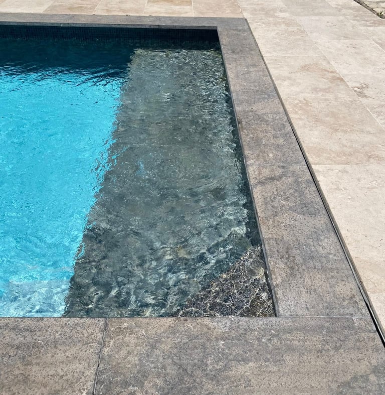 Un cheminement en pierres posées en opus incertum rappelle le style provençal traditionnel, tandis que la piscine moderne en ardoise vieillie contraste élégamment avec le dallage en travertin.